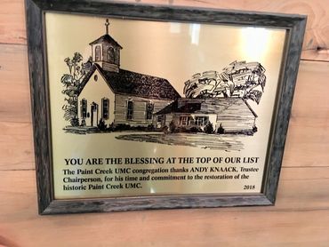 One of our members, Andy Knaack our trustee was awarded this plaque for all his time and commitment to the restoration of Paint Creek UMC.